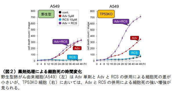 TP53 に変異を有する頭頸部癌由来の細胞株に Adv と RCS を同時に加えると、殺細胞効果が相乗的に増強する結果が得られました。また、正常な TP53 を有する他のがん細胞に遺伝子編集技術を用いて TP53 を欠損する細胞を作成したところ、Adv と RCS の併用による殺細胞効果が TP53 遺伝子の欠損により著しく増強され、Adv+RCS 併用による殺細胞作用の相乗的な殺細胞増強効果は TP53 の変異の有無などに依存することが分かりました(図2)。正常細胞は一般的に TP53 に変異を持たないため、TP53 に変異を持たない正常な細胞に対しては毒性を強めず、TP53 変異を有するがん細胞に対してのみ薬剤の効果を増強する(副作用の効果を強めず、がんに対する薬効を強める)薬の組み合わせを新たに発見しました。