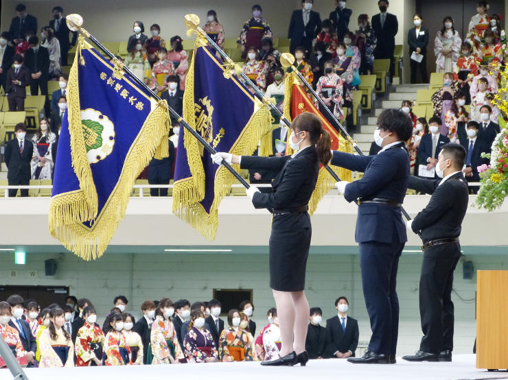 2021年度の卒業式は、新型コロナウイルス感染症対策として参加者を3部に分けて実施。また、家族・保護者等の参加を制限し、卒業生・修了生のみで開催した。