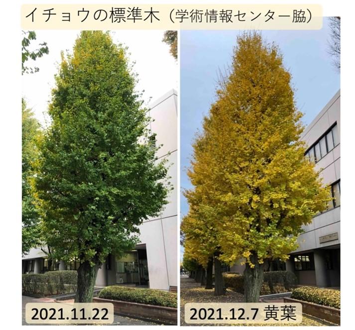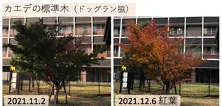 麻布大学構内にはイチョウ並木をはじめとして、四季折々の変化を感じることのできる動植物が数多く生息しています。生物季節の観測では,特定の地点や樹木を継続して定期的に観測することが重要です。麻布大学ではできるだけ周囲の人工物や局所的な環境の影響を受けにくい場所に生育している個体を「標準木」としてキャンパス内で選定し、学生と教員が協力して、2021年9月から第一段階としてイチョウ、カエデ、ウメ、サクラ、ヒガンバナの開花や紅黄葉などの観測しています。2021年は、麻布大学でのイチョウの黄葉が12月7日で(写真2)、気象庁による横浜市での観測結果(12月9日)とほぼ同じでした。カエデの紅葉は12月6日となり(写真3)、気象庁による東京都千代田区での観測結果(11月27日)と横浜市での観測結果(12月24日)の間になりました。麻布大学での観測結果は、これまでの気象庁による観測に神奈川県中西部平野部のデータを加えることになります。