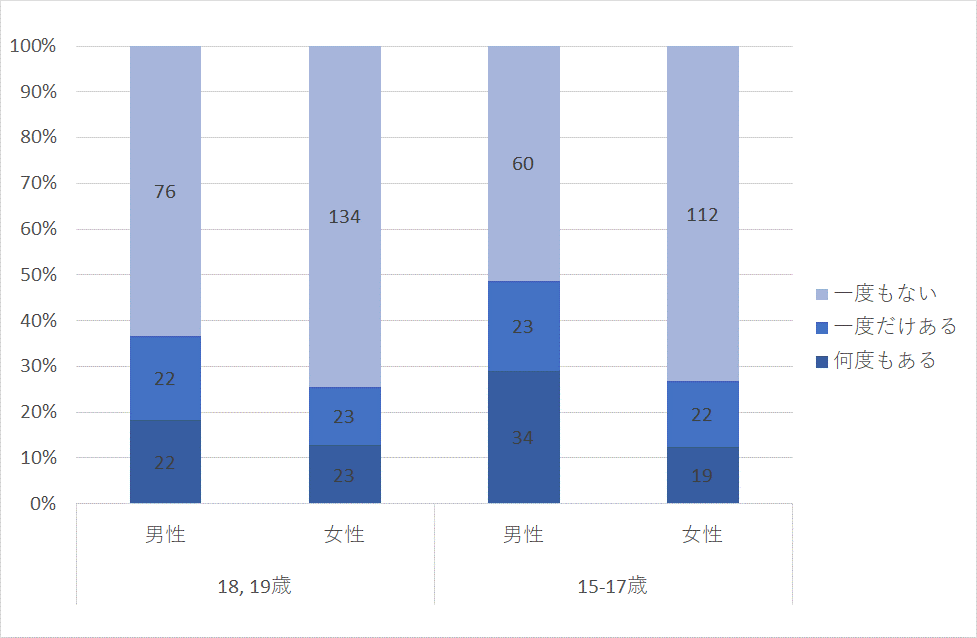 この質問では、後払い決済利用後に、代金を滞納した経験について尋ねています。このようなことを一度でも経験したことがあると答えた人の割合は、後払い決済利用経験者のうち33%(=188/570)でした。この割合は、18,19歳では30%(男性37%・女性26%)、15-17歳では36%(男性49%・女性27%)でした。この割合は女性よりも男性の方が高い傾向があります。また、15-17歳男性の半数近くが代金の滞納を経験したことがあると答えた点にも注意が必要です。