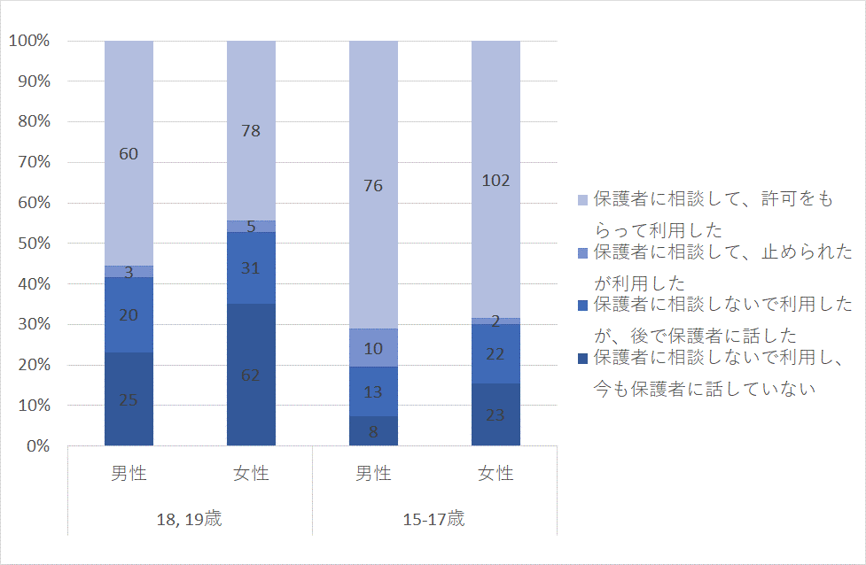 性別では、「保護者に相談しないで利用し、今も保護者に話していない」割合が、男性よりも女性の方が高い点が特徴的です。