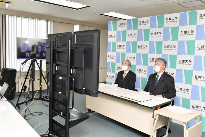 3月1日(火)、札幌大学(札幌市豊平区/学長:大森 義行)とむかわ町、北海道鵡川高等学校の三者による包括連携協定式が行われた。まん延防止等重点措置を受け、協定式はむかわ会場(むかわ町産業会館内)と札幌会場(札幌大学内)の2会場および関係者をオンラインでつなぎ、リモート開催となった。