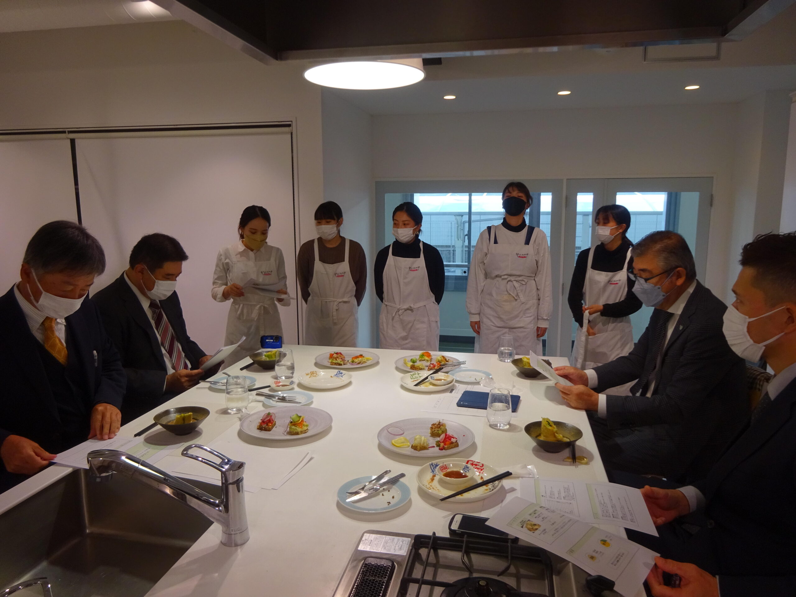 ライフプランニング学科はこれまでさまざまな企業と連携してメニュー開発の実績があったことから、今回、泉佐野市から声をかけていただき、泉佐野産の農作物の品質の良さを訴求すべく、ホテル日航関西空港(泉佐野市)とタッグを組み、メニュー開発に取り組みました。学科内の授業「フードメディア演習」で、まず泉州の地域性と「松波キャベツ」などの泉州野菜の特性について学び、4チームに分かれて「松波キャベツ」を使ったメニューを考案しました。11月25日、学内のキッチンで学生が調理し、コンセプト等をプレゼンテーションする審査会を実施しました。ホテル日航関西空港の総料理長をうならせた上位2チームのメニューが、ブラッシュアップされて実際にホテル内のレストランで提供されています。
