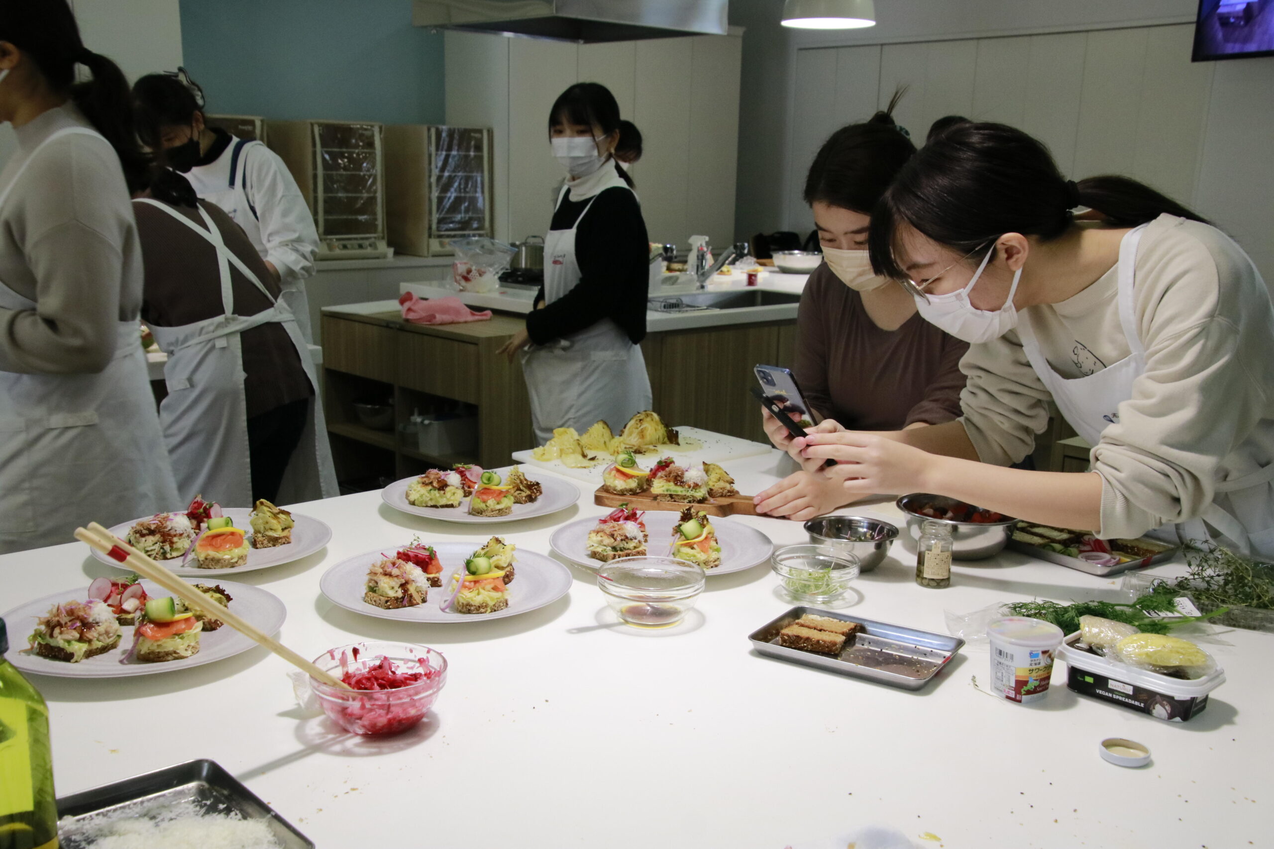 ライフプランニング学科では、生活に関するさまざまな知識やスキル、問題解決方法を学び、より良い生き方を選択できる人材の育成を目指しており、学生は2年次から「ライフデザインコース」と「フードスタディコース」のどちらかを選択します。「フードスタディコース」は、食に関する知識と技術、食文化、食空間、食ビジネスなどを学び、「食」から社会に貢献できる力を身につけます。「フードメディア演習」では、世の中で行われている商業的、かつ文化的なプロジェクトに学生が参画することができます。現代メディアの在り方を理解し、食関連企業とコラボレーションを行いながら、食の流行や企画作りを学び、学生ならではの自由な発想でメニューを考案することを目指します。企画・開発することの面白さを実感できる授業です。