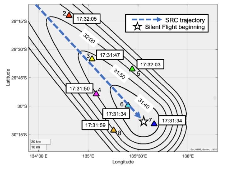 一つ目は、インフラサウンドの観測からカプセルの軌道を高精度で決定できたことです。後方から迫ってくる車の距離と方向を耳で聞いた音から察することができるように、インフラサウンドの観測から物体の距離と方向を決定することができます。今回の観測では28個の耳(インフラサウンドセンサー)を用いて「はやぶさ2」のカプセルの距離、方向、速度を決定しました(図2)。これにより従来のビーコンやカメラでの観測に次ぐ、新たな軌道決定手法が確立できました。インフラサウンドを用いての観測は、ビーコンの故障時、悪天候によるカメラ観測が難しい場合の補助機器として役に立つ他、ビーコンの取り付けられていない自然物体を観測することができます。実際に、2021年の12月6日に伊勢の上空で火球(明るい流星)らしき光とその爆発音のようなものが観測されましたが、同時刻は全国的に曇天であり、カメラによる軌道決定はできませんでした。この場合でも、我々の研究グループは京都大学防災研究所、日本気象協会と共同でインフラサウンドと地震波の観測からその火球の軌道を決定することに成功し、三重県の志摩半島沖に落下したと結論づけることができました。