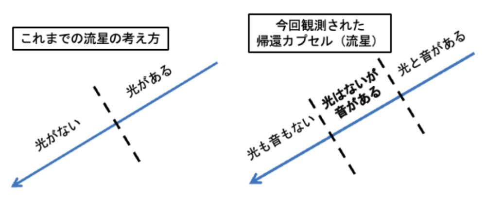 三つ目はサイレントフライトという新たな概念(呼称)の確立です。以前から流星などの超高速の飛行物体が大気圏を通過する場合、音と光を出すことは知られていました。しかしその音を出す条件と光を出す条件の関係性はよくわかっていませんでした。今回の「音」の解析結果から、光を出す時間よりもカプセルが音(インフラサウンド)を出す時間が、約1秒、距離にして10km程度長かったことを発見しました(図4)。この新たな「聞く」という視点から、流星などの飛行物体が超音速で大気中を通過した場合のエネルギーの放出や融解、崩壊現象について、「見る」ことしかできなかったこれまで以上に理解が深まります。
