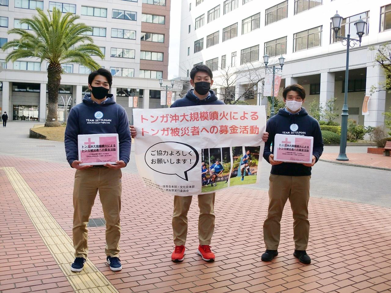 寝屋川キャンパスに練習拠点のある体育会ラグビー部にはトンガからの留学生が2人います。幸い彼らのご家族に被害は無かったものの、留学生の故郷トンガを少しでも応援したいと今回のプロジェクトが立ち上がりました。今後は、3月11日、17日、24日に京阪本線 寝屋川市駅前・香里園駅前・樟葉駅前での街頭募金を予定しています。集まった募金は日本赤十字社などへの全額寄付を通じて、現地支援へとつなげていきます。このプロジェクトは、枚方キャンパスの課外活動団体の学生が声を上げたものです。今回の募金活動をきっかけに被災地の復興をはじめ、寝屋川キャンパスと枚方キャンパスの課外活動団体の交流を深め、今後も互いに支え合い、応援し合う関係を構築していきます。