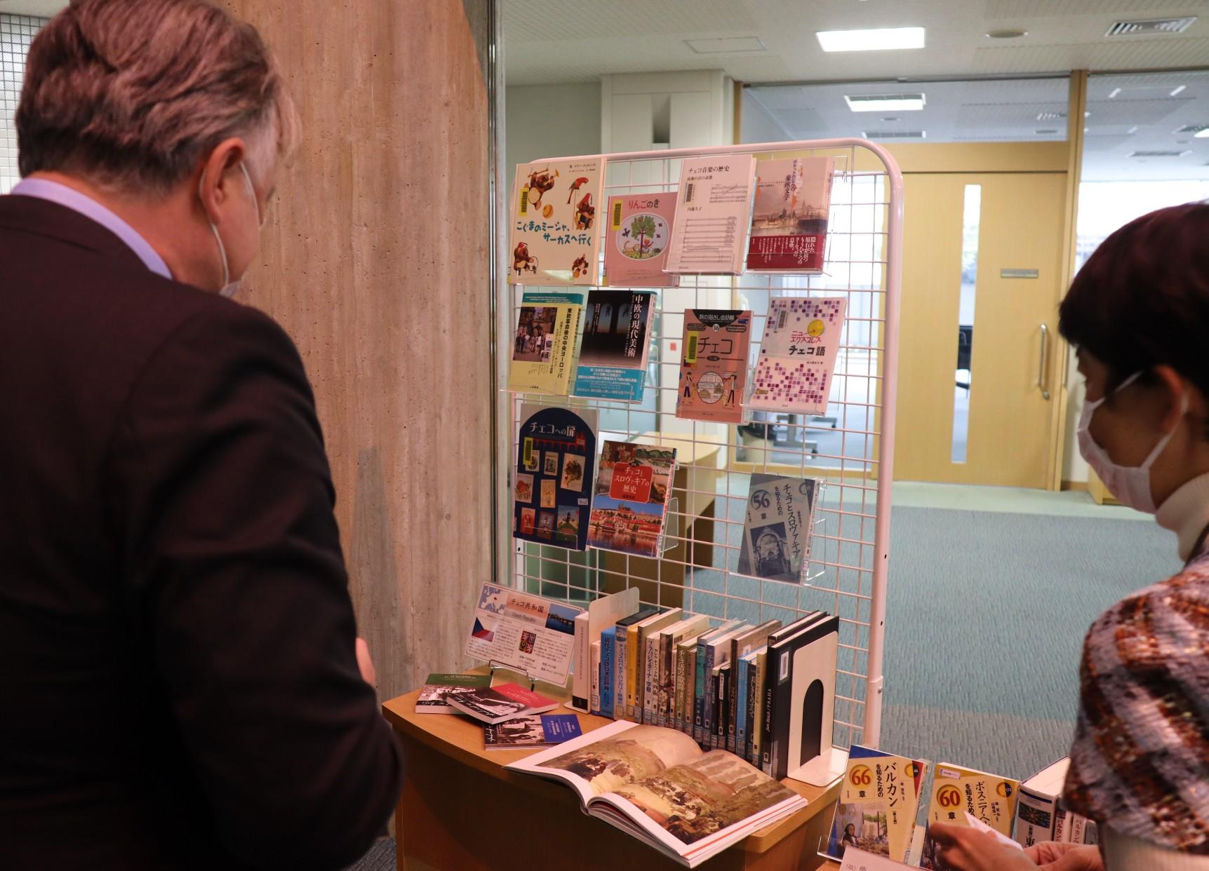 本学図書館が所蔵するチェコ関連図書を見学したあと、トムチョ大使はチェコ留学を控えた千葉さんと面談しました。千葉さんはチェコ語で自己紹介し「現地でチェコ語と英語を学んできます」と話しかけると、大使は笑顔で「とてもきれいな発音ですね」と勉強の成果を称えました。「チェコにはさまざまな歴史的建築物や博物館があり、大変美しく、安全な国です。現地での滞在を楽しみ、チェコの文化に触れてください」と、コロナ禍に加え、国際情勢が不安定ななかで留学準備を進める千葉さんを励ましました。