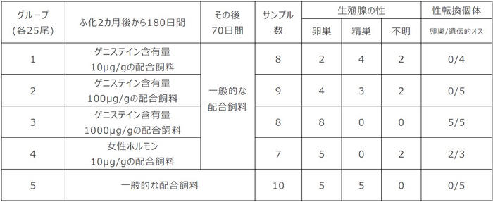 また、遺伝的にはオスであるが卵巣を持っていた個体の割合は、ゲニステイン含有量10µg/gのグループでは4尾中0尾(0%)、100µg/gのグループでは5尾中0尾(0%)でしたが、1000µg/gのグループでは5尾中5尾(100%)、女性ホルモンのグループでは3尾中2尾(67%)でした。