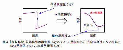 一般的には、ある特定の温度で負熱膨張を示し、それ以外の温度では通常の正の熱膨張となる。負熱膨張を示す温度を動作温度と呼ぶ。相転移にともなう体積変化を用いた「相転移型」負熱膨張材料の場合、負熱膨張の度合いである負の線膨張係数αと動作温度幅ΔTは、体積収縮量ΔV/V とΔV/V=3αΔTの関係で結びつけられており、動作温度幅を拡げれば、負熱膨張の度合いが小さくなる(図4)。そのため、熱膨張抑制能力の本質は体積収縮量にあり、体積収縮量の大きな物質・材料を探し出し、構成元素の置換や欠陥・乱れの導入などの材料学的手法により動作温度幅を拡げる取り組みが必要である。