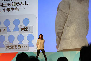 当日は、同研究室4回生の大嶋智子さんがプレゼンテーションを行った。開発したアプリを活用してコミュニケーションの活性化を図り、研究推進に取り組んだ事例を発表。会場内で行われた投票の結果、同研究室の事例が第2位を獲得した。
