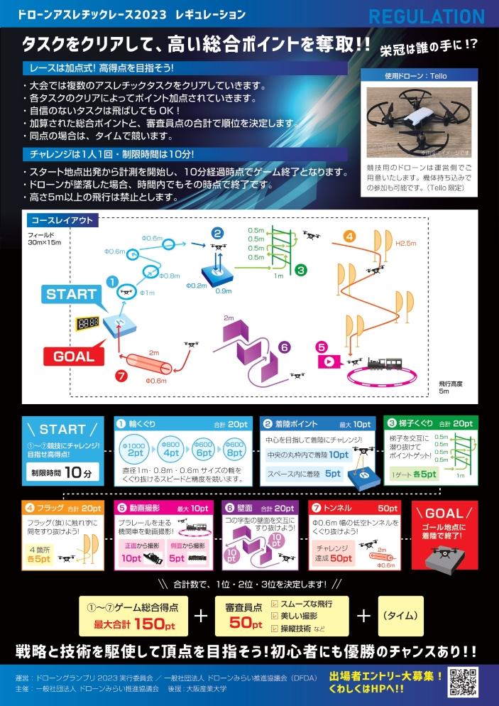 大阪産業大学(大阪府大東市)体育館において、5月28日(日)に「ドローンアスレチックレース 2023」第1回プレ大会(主催:一般社団法人ドローンみらい推進協議会)が開催される。これは、大学生、高専生、高校生を対象とした競技大会で、輪くぐりや動画撮影などの複数のタスクをクリアしていく加点式のタイムアタックレースを行う。ドローンは運営側が用意する機体のほか、持ち込みも可能(TELLO限定)。出場者は事前エントリー制(無料)。当日の会場への入場は一般500円、学生・出場者の家族・小学生以下は無料。