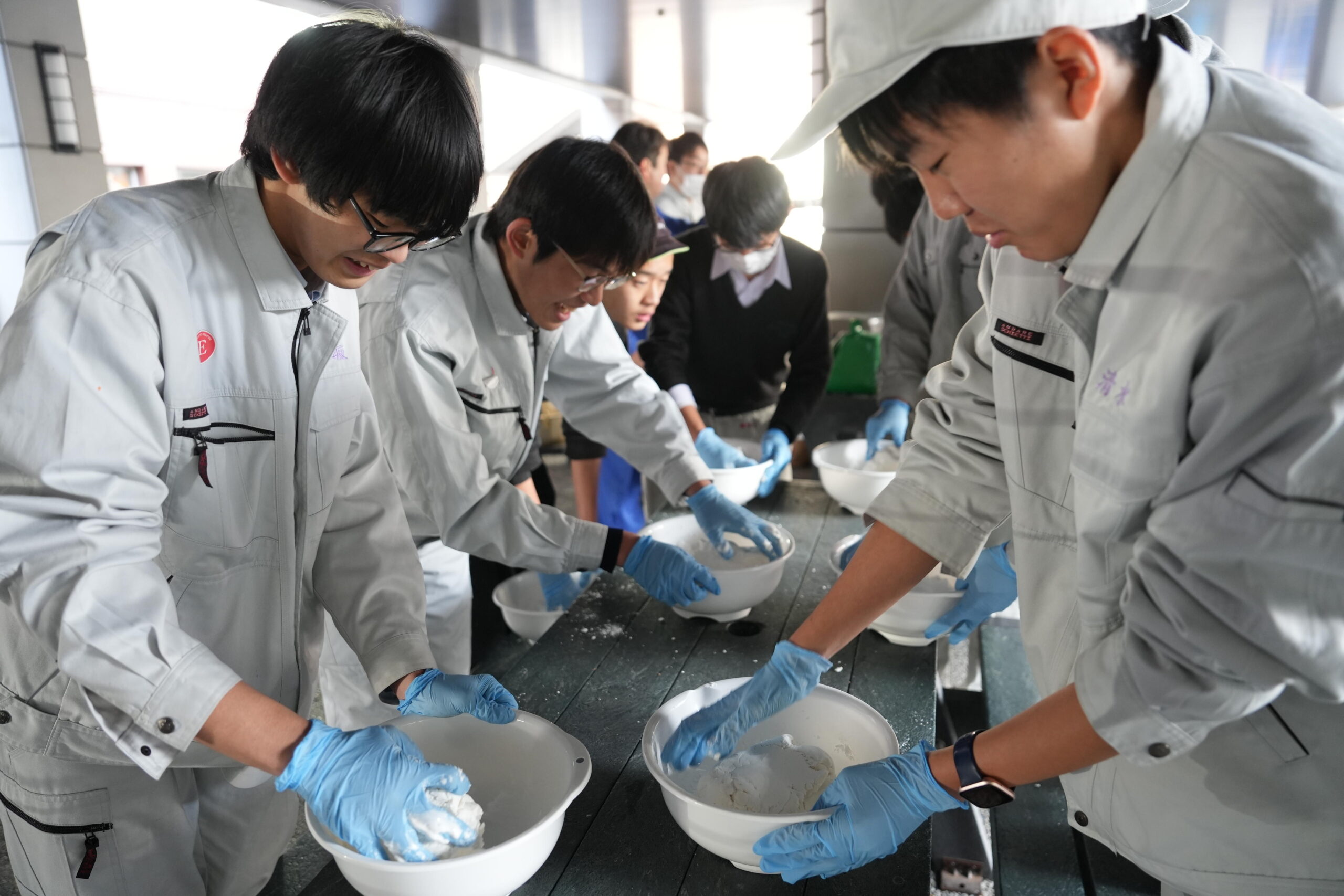 当日は20kgの米粉が用意され、リーダーである由川陽介さん(工学部 電子情報通信工学科3回生)の指示のもと、「こねる」→「茹でる」→「杵でつく」という工程で生地が作られました。巨大煎餅を焼く移動式炭火台や特製金網などは、この日のために学生が手作りし、煎餅の大きさに合わせて巨大なものが用意されました。