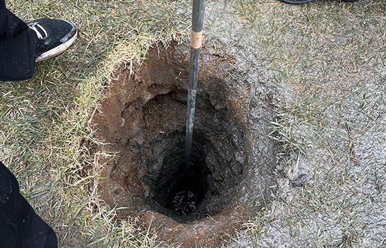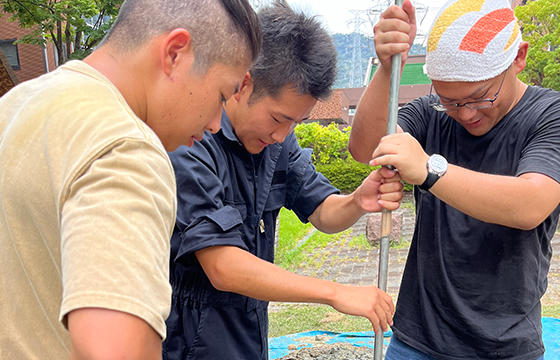 手動のドリルで掘り進め、硬い岩盤は振動ハンマーで砕き手で取り除くなど、炎天下で作業を進めること5時間。