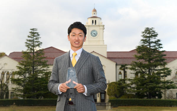 学長賞は、教育、研究、スポーツ、文化、芸術、社会貢献等の分野において、本学学生を鼓舞する活躍をし、大学の名誉を高めることに特に顕著な功績を収めた同窓生に授与しようと創設されたもので、近本選手がその第一号となります。