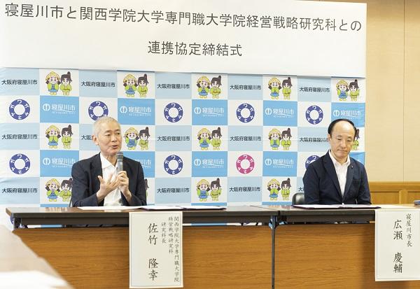 締結式には、寝屋川市から広瀬慶輔市長と市川克美副市長、本学から専門職大学院経営戦略研究科の佐竹隆幸・研究科長と、玉田俊平太・副科長が出席しました。