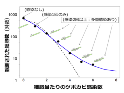 今回、寄生実験において観測された多重感染の数は、プランクトンとツボカビの接触がランダムに繰り返されたときに想定される数(図2の破線)よりも大きく、一部のプランクトン個体に寄生が集中していることが明らかになりました(図2)。多重感染度の高い個体は新たな寄生を引き起こす力が他の個体よりも大きいと予想され、感染症拡大の新たな起点になる可能性があります。このような特別な個体の存在は人間や動物における様々な感染症でよく知られた現象ですが、植物プランクトンを起点とする湖の食物連鎖では初めての発見です。