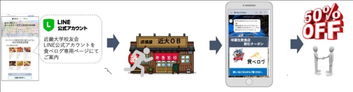 特設サイトでは、卒業生が経営する飲食店101店舗と、東大阪キャンパス前の商店街に店を構える飲食店9店舗を紹介し、店舗で使用可能な卒業生向け公式LINEアカウントに登録いただいた方に割引クーポンを発行します。