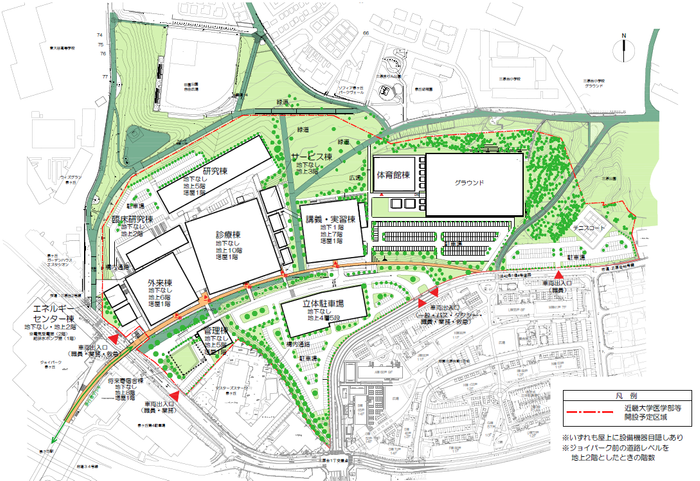 近畿大学医学部・近畿大学病院計画図 ※本資料に掲載している計画図は、現時点でのイメージであり、今後の検討により変更の可能性があります。泉ヶ丘駅からの道をそのまま敷地内に延長し、敷地全体を横断するブリッジへと接続させ、現在敷地内にある「緑道」へと接続し、各病院施設へは、このブリッジを介してアクセスが可能とする予定です。