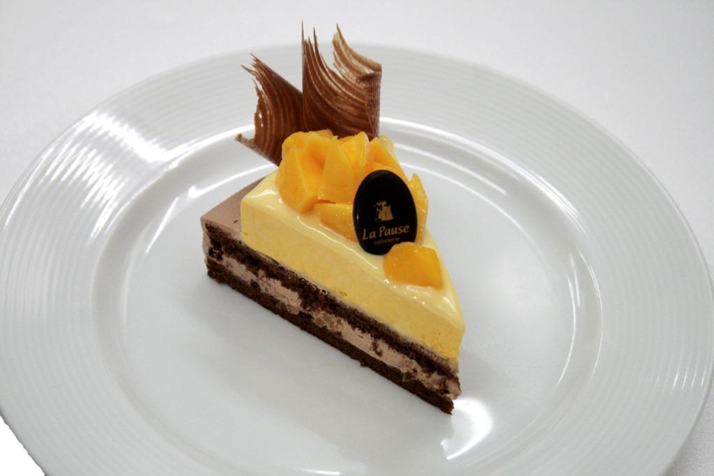 近大マンゴーと自家製オレンジコンフィをサンドしたチョコレートケーキの上に、マンゴームースをのせました。