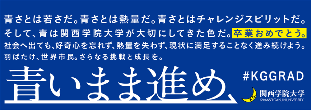 関⻄学院大学は、2022年度秋学期の卒業生に向けて贈るプロジェクト『青いまま進め』を実施します。本企画は、OB・OG、教職員から卒業生へのメッセージを募るだけでなく、卒業生からの喜びの声も集める、SNSを活用した参加型企画です。2023年3月17日(金)・20日(月)の二日間に卒業式を迎える総勢約5,000名の学生たちへのエールを込めたもので、本日3月10日(金)より、ハッシュタグ「#KGGRAD」で集まった投稿を特設サイトにて公開します。