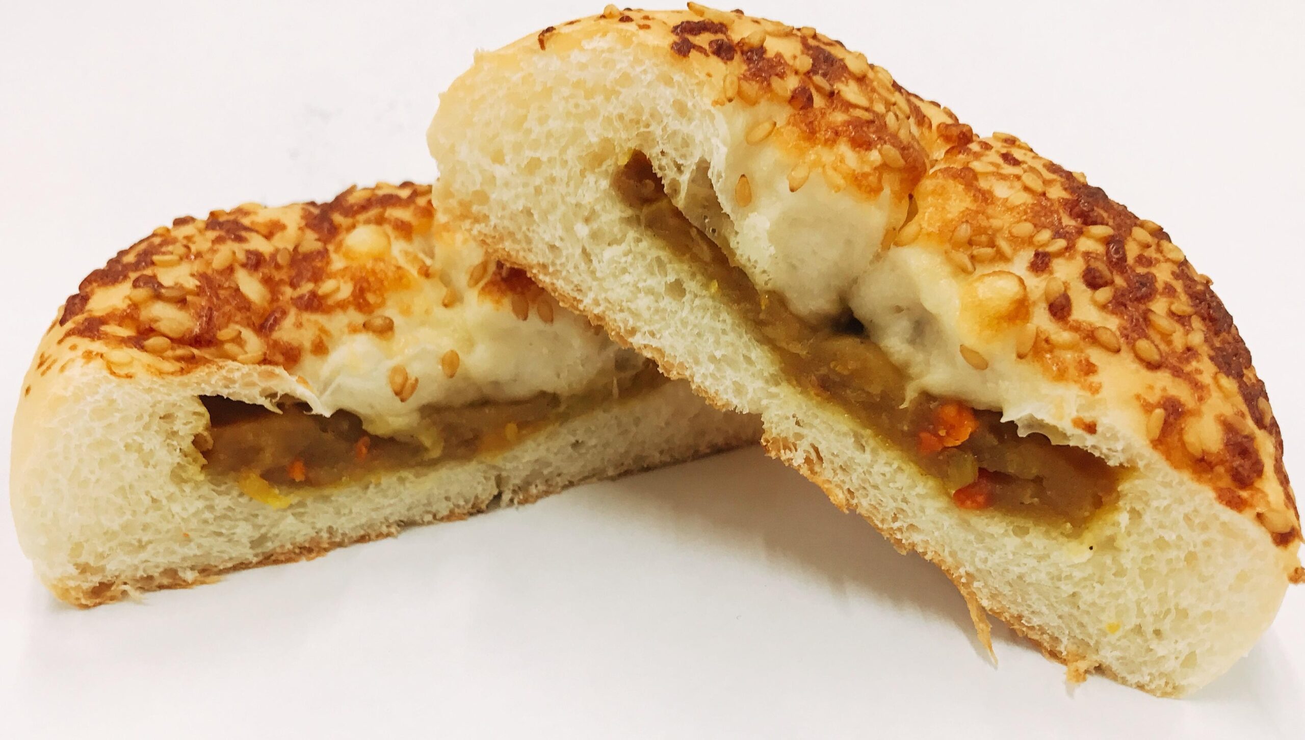■商品特徴 :近大マグロの中骨を煮出したエキスと隠し味に生姜を使用した和風カレーを包み、ごまとチーズをトッピングし焼き上げました。