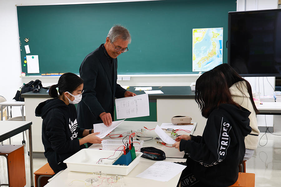 11月14日には、教育学部の1・2年生3名が理科室を利用し、「電流」についての実験の復習をした。理論上は問題のない電気回路でも、現実には電池の電圧低下や接触不良などにより、思いどおりに回路が繋がらない場合がある。こうした点が、模擬授業で理科実験を行う難しさだといえる。