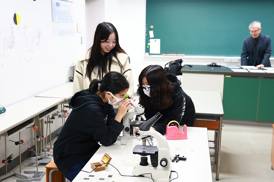 この日は実験の合間に、新田講師が石の薄片を偏光レンズ越しに見せてくれる一幕もあった。レンズを回転させると光の向きが変わり、石に含まれる鉱物がさまざまな色に輝く。学生たちは「万華鏡みたいにきれい」と驚いた様子で見入っていた。