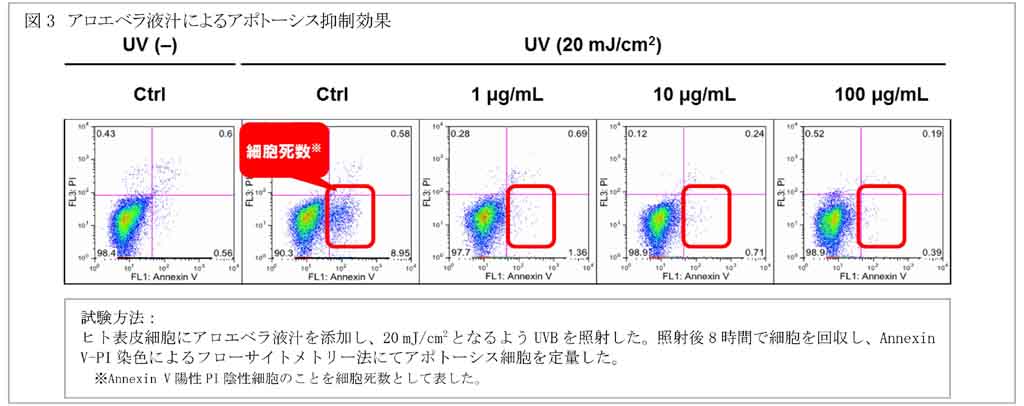 次に、実際に細胞死(アポトーシス)が起きているかを、ヒト表皮細胞を用いて細胞の膜表面に着目して測定したところ、アロエベラ液汁を添加したヒト表皮細胞では、細胞死(アポトーシス)にむかっている細胞がほとんど認められないことが確認できた(図3)。アロエベラ液汁を添加することで、紫外線に晒されるなかでも細胞が健全な膜状態を維持しており、紫外線からのダメージを免れていることが確認できた。
