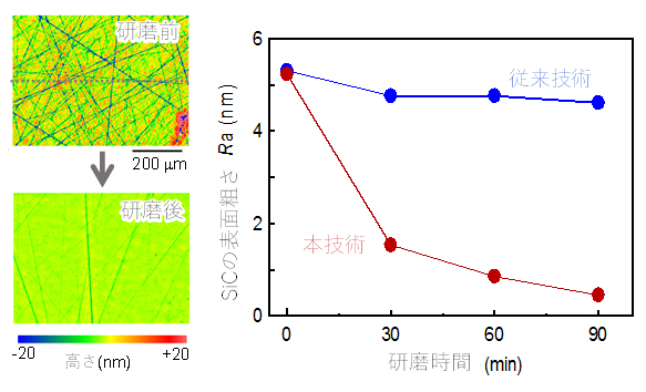 本技術によるSiC表面の加工実験を行った結果、精密研磨には必須であった研磨パッドを用いることなく、研磨前の表面に存在していた傷が減少し、表面粗さも約5nm(ナノメートル)から0.5nmに低減した(図2左)。また、市販の研磨剤を利用した従来加工技術との比較を行った結果、本技術がより短時間で優れた表面粗さを達成することを確認した(図2右)。