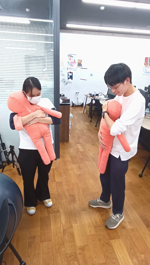 人型の抱き枕で相手の心拍・ハグ動作を再現するシステムです。相手の心拍は腕に装着したウエアラブル端末で、クラウドに送信します。さらに人型抱き枕をハグした場合、センサーで捉え、クラウド経由で受信側に送信します。受信側は抱き枕に装着したスマートフォンの Web アプリで相手側の心拍を再現し、ハグした情報は通信機能が搭載されたマイコン・ボードで相手の抱き枕に内蔵された腕機構を動かします。今回の展示においては、人型の抱き枕とスマートフォンの間をBluetoothで接続可能にする事で、WiFi環境のみならず、5Gなどの携帯通信環境での二つの抱き枕を連携させることに成功しています。