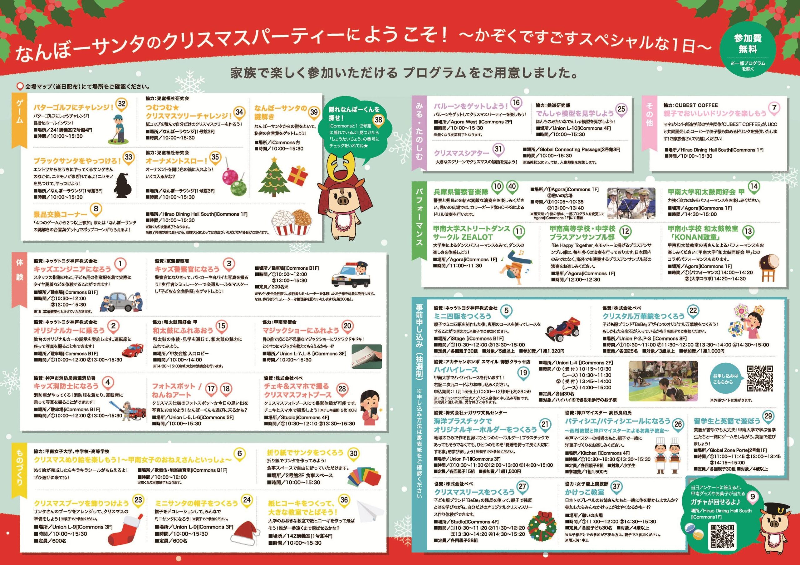 今回は、サンタに扮した大学公式キャラクター「なんぼーくん」による謎解きをはじめ、クリスマスに関連したさまざまな企画に加え、女子陸上競技部による「かけっこ教室」、フォトブース/ねんねアート、キッズエンジニア、お菓子教室などの体験プログラム、音楽やダンス・和太鼓のステージパフォーマンス、パトカーや白バイ、消防車との記念撮影、電車模型の見学など、盛りだくさんの内容で来場をお待ちしています(一部プログラムを除き事前申し込み不要)。