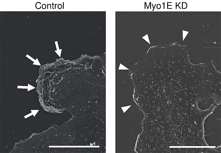 さらに今回、RELの形成と運動に関わる新たな分子として、モータータンパク質「ミオシン-1e(Myo1E)」を同定しました。Myo1Eは、細胞膜とアクチン線維をつなぐことで膜形状を変化させ、細胞の運動を促進する役割を担っていると考えられます。浸潤性肺がん細胞株A549を用いた実験では、Myo1EがRELの先端に局在し、阻害剤の添加やRNA干渉によるノックダウンによりRELの形成と細胞移動が著しく抑制されることが超解像顕微鏡や電子顕微鏡観察などにより確認されました2)。
