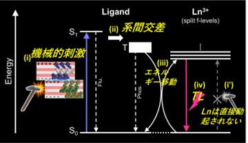 総括すると、本研究では、アミノ酸を有するキラルな希土類錯体のラメラ構造の結晶を用いて機械的エネルギーを発光に変換する系は、配位子の励起状態(特に励起三重項状態)を経由したアンテナ効果によるものであることを証明した(図4)。このような系の実用化はまだ実現しておらず、原理解明は未来に向けた新たな発光材料を指向するきっかけになる。