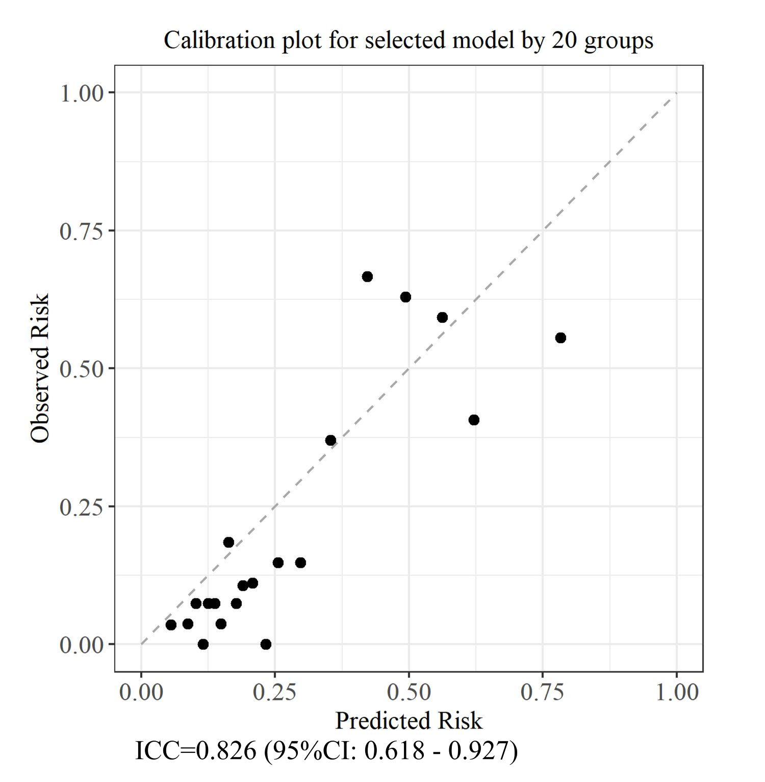 その結果、検証データではROC-AUC 0.808(95%CI 0.763-0.853)、ブライヤースコア0.135と高い識別能と良好な予測精度を維持しました。キャリブレーションでは、全体として予測確率と観測リスクは概ね整合し、高リスク帯でやや過大推定の傾向がみられたものの、ICCは0.826と良好な一致度を示しました。