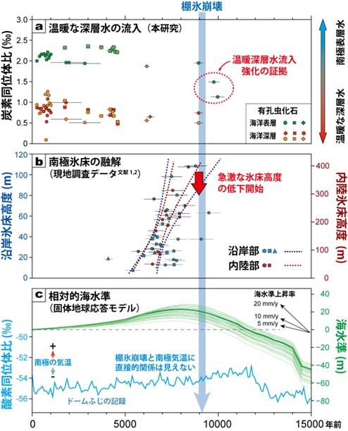 ・南極沿岸の海底堆積物の分析と数値モデルシミュレーションから、約9000年前に暖かい海洋深層水が沖合から湾内に流入したことで棚氷(注1)が崩壊し、それが南極氷床の急速な縮小を引き起こしたことを明らかにした。