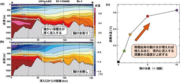 ・図5 気候モデルおよび高解像度の海洋モデルを用いたシミュレーションによって明らかになった融け水とリュツォ・ホルム湾への周極深層水の流入の関係。リュツォ・ホルム湾における水温分布の断面図。約9000年前の地球環境を再現し、そこに南極氷床由来の融け水を考慮した結果(a)、リュツォ・ホルム湾に融け水なしに比べて(b)、暖かい深層水が厚く流入することが明らかになった。さらに、融け水を増やすほど、流入する深層水の水温が上昇する傾向を示しており(c)、氷床融解による融け水供給と深層水流入の間にフィードバック効果が存在することが示された。