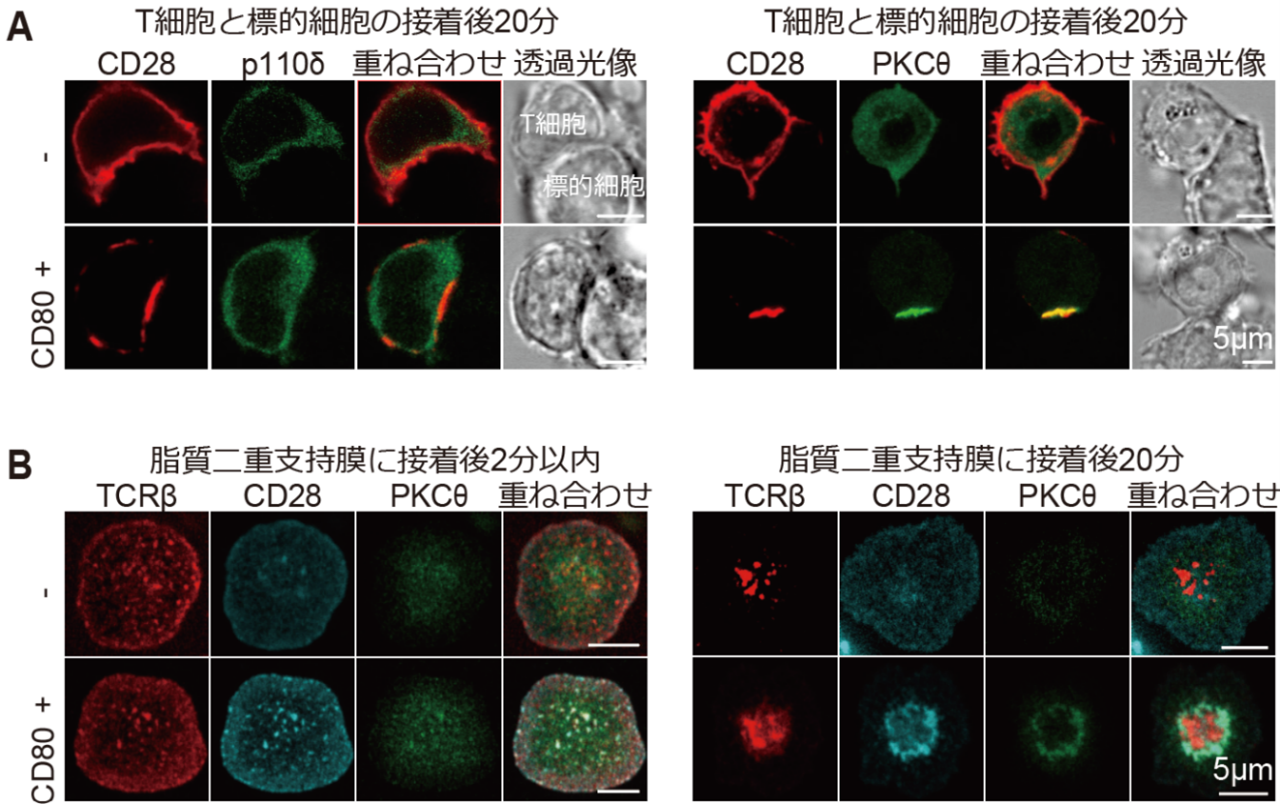 まず、腫瘍抗原を認識できるT細胞と腫瘍細胞を用いて、細胞-細胞接着面に集まるシグナル伝達分子を観察しました。CD28下流の代表的なシグナル伝達系として、①グルコース受容体などでも重要なPI3K-Akt-mTOR経路と、②がん化などに関わる活性化シグナルPKCθ-NF-κB経路が知られています。CD28を発現するT細胞とCD80を発現する腫瘍細胞を接着させると、それら細胞-細胞接着面にはPI3Kの触媒ユニット:p110δではなく(図4A右)、NF-κB経路の上流に位置する非典型プロテインキナーゼPKCθが顕著に集積しました(図4A左)。より詳細な分子の挙動を観察するため、SLBを腫瘍細胞の疑似膜として用い、T細胞-SLBの接着面を観察すると、PKCθ(緑)はTCR(赤)-CD28(水色)マイクロクラスターと重なることがわかりました(図4B左)。接着後20分を経過しても、TCRとCD28とPKCθは免疫シナプスの中心部に残り、この現象は2ndシグナルとしてのNF-κB経路の「持続」を意味しています(Yokosuka et al., Immunity, 2008)(図4B右)。