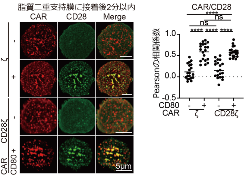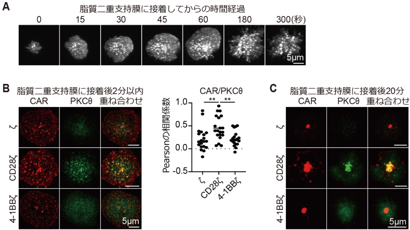 次に、B細胞性腫瘍を標的とした、抗hCD19抗体の抗原結合部位にCD28とCD3ζ鎖の細胞内領域を連結させたhCD19-CD28ζ.CARをT細胞に遺伝子導入し、hCD19を発現させたSLBとの接着面でのCARの挙動を観察しました。CARはhCD19との接着により、SLBとの接着面上でCARマイクロクラスターを形成しました(図5A)。hCD19-CD28ζ.CAR-T細胞は、SLBとの接着面を広げながら拡大し、その接着面にはhCD19-CD28ζ.CARの凝集塊「CARマイクロクラスター」が次々に形成され、60秒後に最大限に広がるとCARマイクロクラスターは求心性の移動を始め、免疫シナプスの中心部に集積しました(図5A)。さらに、細胞内領域にCD3ζ鎖のみを用いた第一世代のζ.CAR、そして第二世代のCARでもCD28の代わりに別の共刺激受容体4-1BBを用いた4-1BBζ.CARでも、マイクロクラスターの形成と挙動は同等でしたが、PKCθはCD28ζ.CARのみに集まり、CD28下流のシグナル伝達分子としての特異性が示されました (図5B,C)。この結果は、CARから直接的な2ndシグナル、つまり「リニア」な2ndシグナルが伝わったことを示します(図2C)。