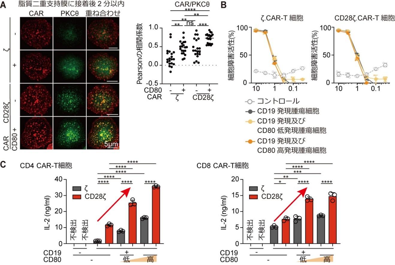 次に、CD28下流で働く活性化分子PKCθ(緑)を指標に、CAR(赤)およびCD28から2ndシグナルが惹起されているかを検証しました。hCD19-ζ.CARが腫瘍抗原hCD19との結合により形成されるクラスターにはPKCθの信号は検出されませんが(図7A 上段)、SLB上にCD80がありCD28がクラスター化する条件では(図6 2段目)、PKCθの信号が検出されています(図7A 2段目)。これはCAR-T細胞にもともと発現している内在性のCD28からの「パラレル」な2ndシグナルと考えられます。一方、hCD19-CD28ζ.CARマイクロクラスターには、CD28-CD80結合がない条件下でもPKCθの信号が検出され(図7A 3段目)、CARに組み込まれたCD28からの「リニア」な2ndシグナルが惹起されていること、さらにCD28-CD80結合の存在下では、PKCθの信号は増強し(図7A 下段)、「リニア」+「パラレル」のダブルの2ndシグナルとして増強することが観察されました(図7A グラフ)。これら2ndシグナルがCAR-T細胞の機能にどのように寄与するかを検証するため、まず、in vitro(試験管内)でhCD19陽性細胞に対する殺腫瘍効果を調べましたが、ζ.CAR-T細胞とCD28ζ.CAR-T細胞、およびhCD19標的腫瘍細胞のCD80発現の有無での違いはありませんでした (図7B)。つまり、hCD19-ζ.CAR-T細胞もhCD19-CD28ζ.CAR-T細胞も、1つ1つの細胞の殺腫瘍効果は同じ、ということです。しかし、同じ条件下において、活性化の指標となるサイトカイン産生を測定すると、2ndシグナルの強弱とサイトカイン産生能とが相関することが分かりました(図7C)。