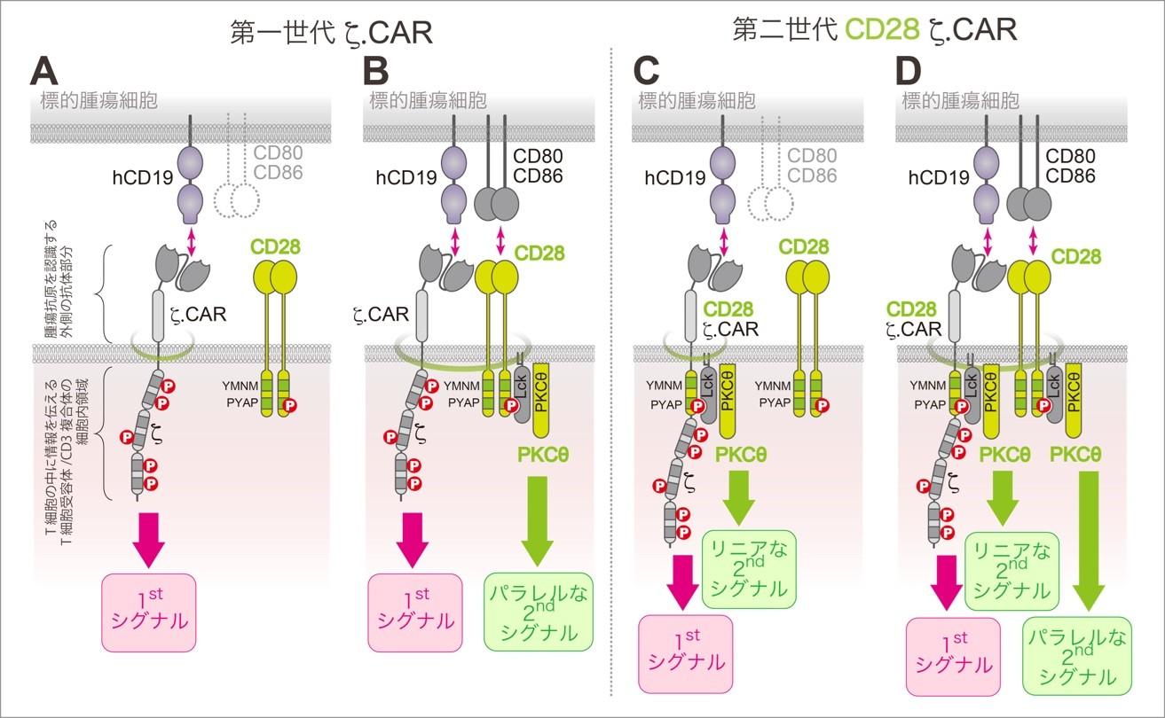 今回協同研究チームでは、CAR-T細胞自身にも内在性のCD28が発現していることに注目し、そこから発信される「パラレル(並列的)」な2ndシグナルと、第二世代CD28ζ.CARから直接発信されるの「リニア(直列的)」な2ndシグナルによって制御されるCAR-T細胞の殺腫瘍効果の違いを検討しました(図2)。