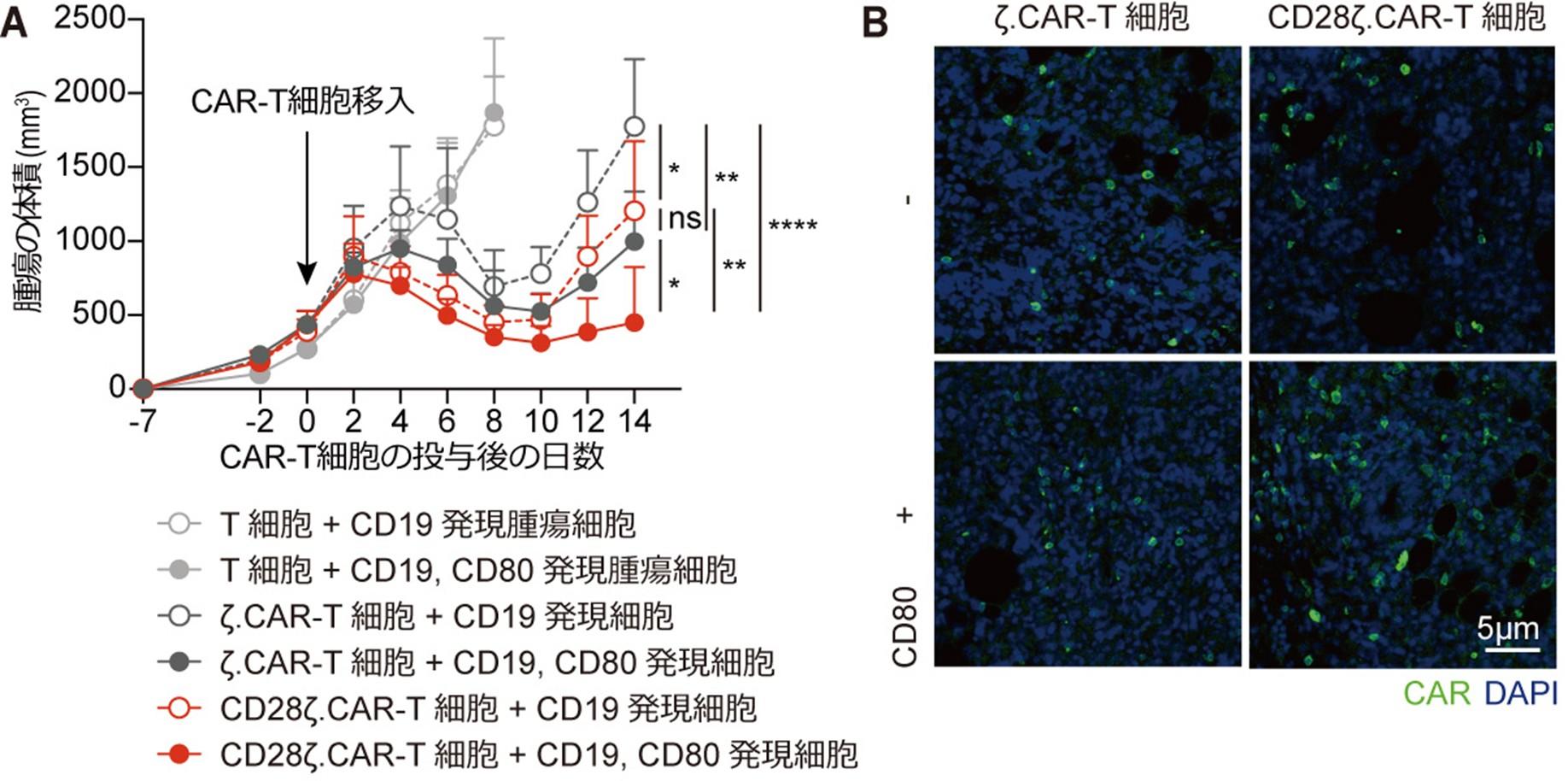 ●CD28によって活性化信号が増強したことで、第二世代CD28ζ.CAR-T細胞がより腫瘍に浸潤し増殖を抑えることが、担癌マウスモデルを用いた実験から明らかになりました。