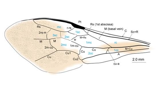 化石の頭部は保存されていなかったものの、胸部、腹部、前翅、脚の一部が保存されており、背面側の印象が保存されているもの(図2左)と腹面側の印象が保存されているもの(図2右)が得られました。翅脈の細かい部分(図3)まで観察でき、腹部の黄褐色の長い毛や、脚に生えている毛など見事に保存されていました。化石は大型であり、推定全長24mmの女王バチであることもわかりました。