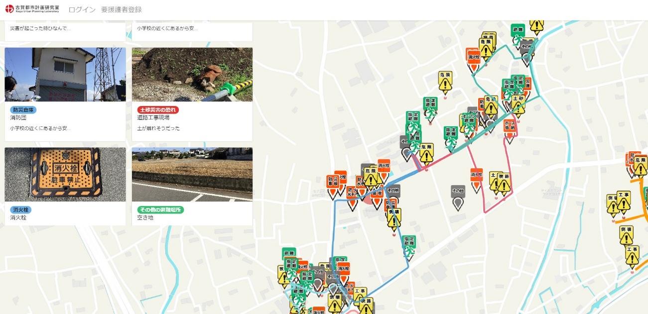 今回は、益城町の広安小学校の4年生(129名)を対象に実施します。4年生が22グループに分かれて、小学校区内(ルートは別紙参照)を点検し、危険な箇所などは,iPadで写真を撮ります。午後、会場(体育館)で防災点検マップを作成します。マップづくりでは、古賀研究室が開発した『防災点検マップ作成システム』を使用します。このシステムは、デジタルマップ上に危険な箇所の写真とコメントを入力することができます。また、複数の地域で実施した点検マップづくりの情報を共有することができ、意見交換会での支援ツールとして活用します。