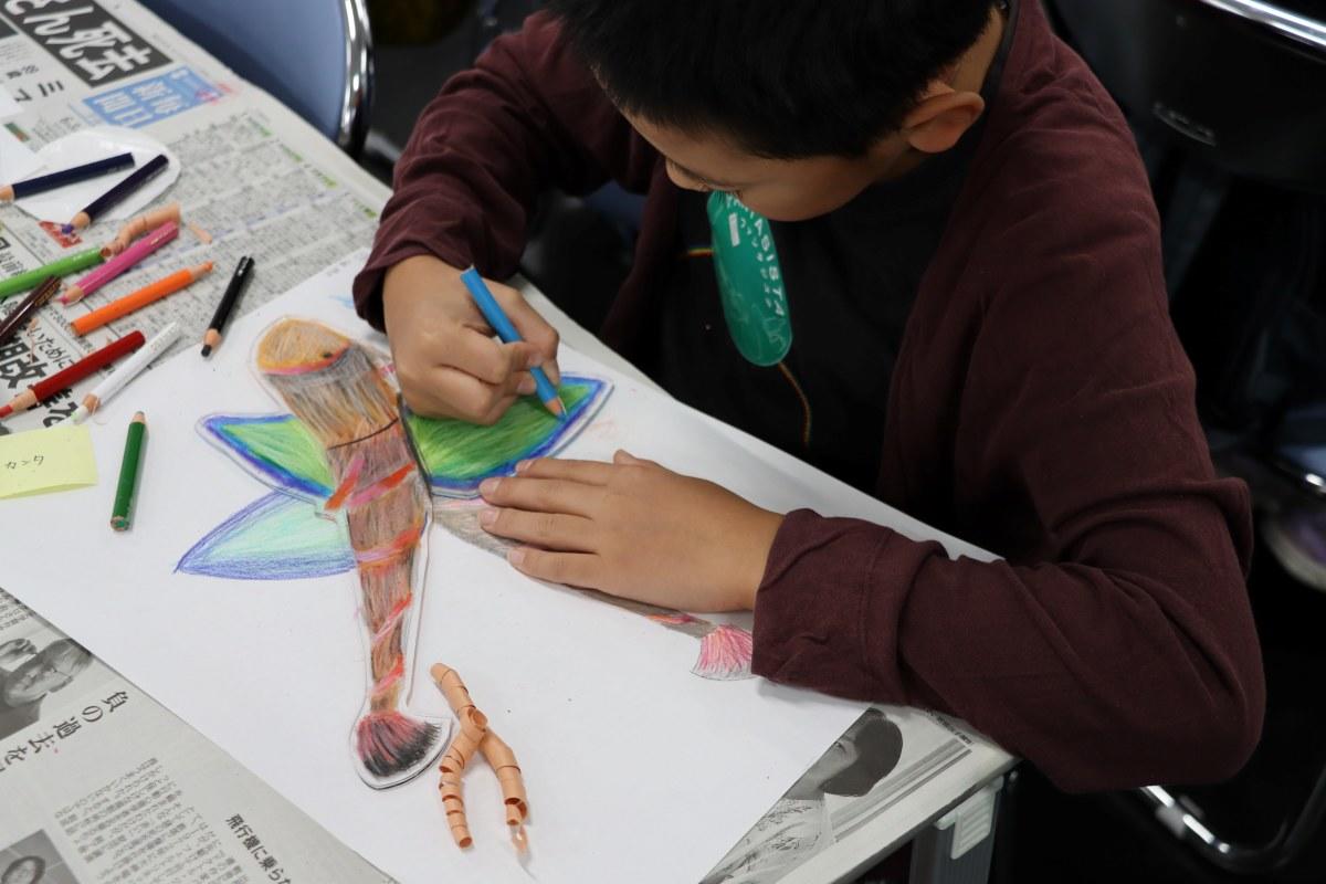 一方、「UPCYCLE」の資源循環の視点からは、さまざまな創作が生まれています。例えば、コロナ禍で使われ廃棄されたアクリルパーテーションを再利用し、葛西臨海水族園で海の生態系を学びスケッチした海洋生物の絵をもとに、切り出して着色したアクリルプレート作品を制作しました。