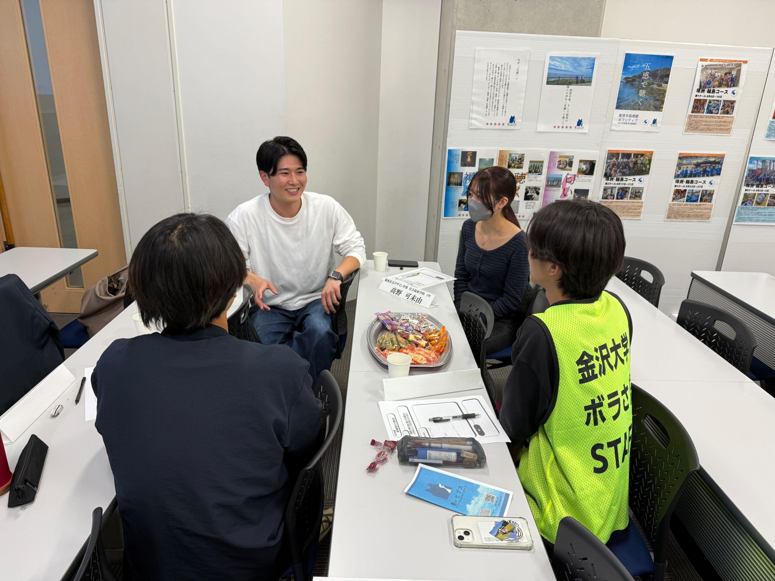 第2部では、本学ボランティア参加学生と金沢大学の学生によるグループディスカッションが行われ、「現地で感じることができた五感」を挙げ、それから考えられることについて活発な意見交換が行われました。会場内では各コースの活動写真や感想をまとめたパネル展示も実施されました。金沢大学と本学の学生は、能登でのボランティア活動をきっかけにつながり、定期的に情報交換するなど交流を深めており、今回の報告会には5名の金沢大学生に参加いただきました。
