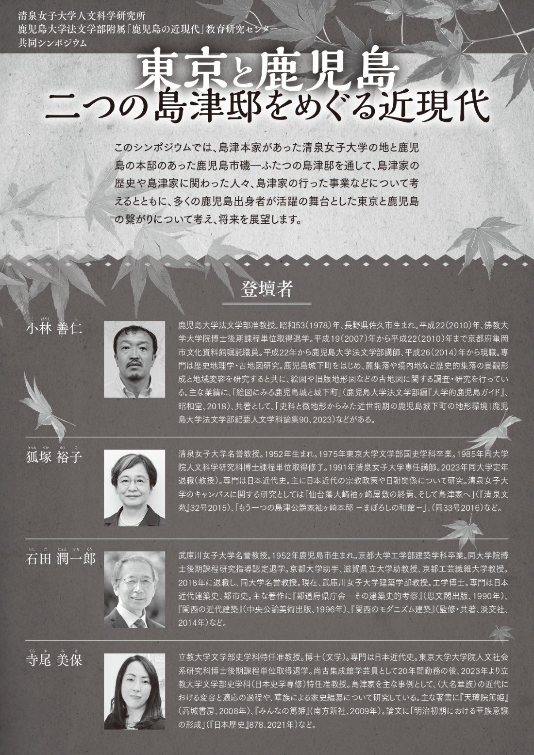 このたびのシンポジウムは、清泉女子大学人文科学研究所と、鹿児島大学法文学部附属「鹿児島の近現代」教育研究センターが共同で開催するもの。東京と鹿児島の2会場をオンラインで繋ぎ、4つの講演と討論を行う。また、開会前には、東京会場の清泉女子大学で本館見学ツアー、鹿児島会場で城下町まち歩きツアーをそれぞれ実施する。