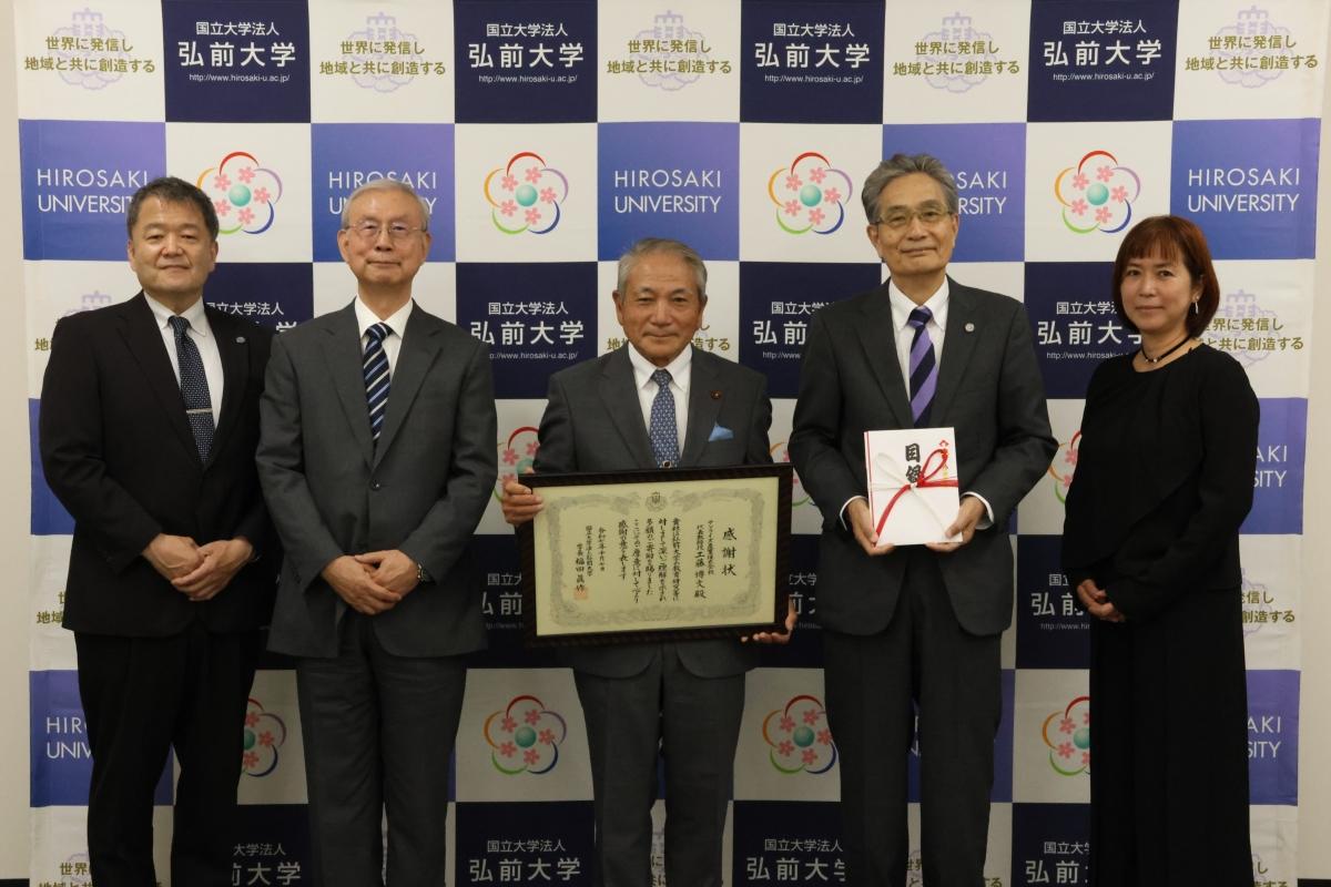 このたび同社から、令和7年度からの10年間にわたってさらなる継続的な支援の申し出があり、10月7日に弘前大学創立50周年記念会館で寄附金目録贈呈および感謝状の贈呈式を執り行いました。