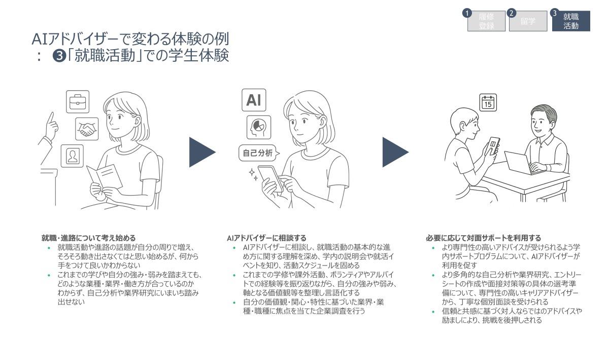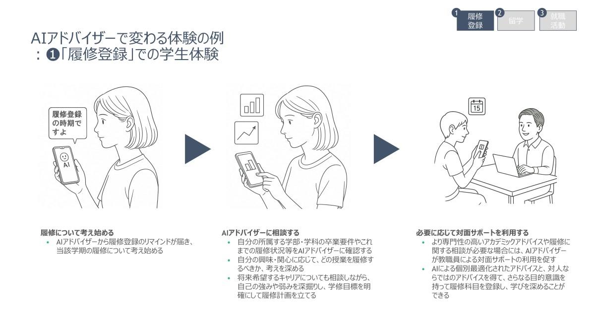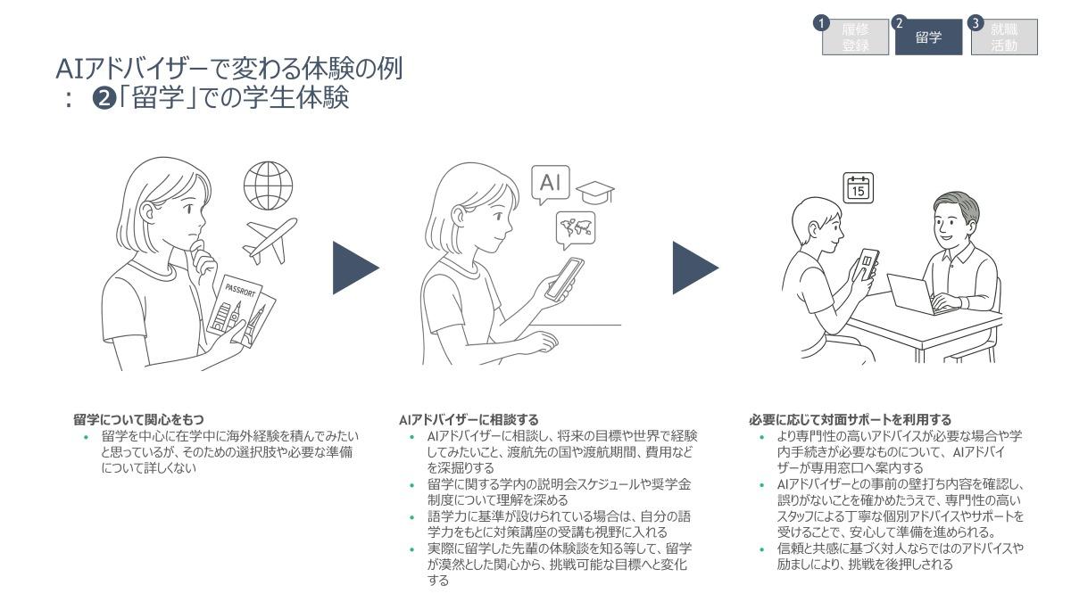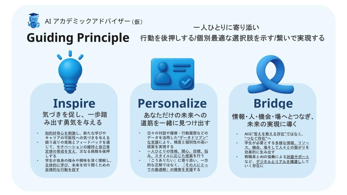 このマルチエージェント構成の仕組みは、従来の単一エージェントによる構成と比較して、正確性(精度の高い応答)、保守性(応答の改善のし易さ)、拡張性(新しい分野への拡張)の点で優れており、日本の大学における独自アプリへの採用・実装は初となる。また、学生のCXを重視し、「Inspire」「Personalize」「Bridge」の3つを開発原理に掲げ、全てを同アドバイザー上で解決しようとするのではなく、学生の気づきや挑戦を促し、教職員による丁寧な支援を必要とする場面では、対人支援に適切に繋げていくことをめざした点も大きな特長である。