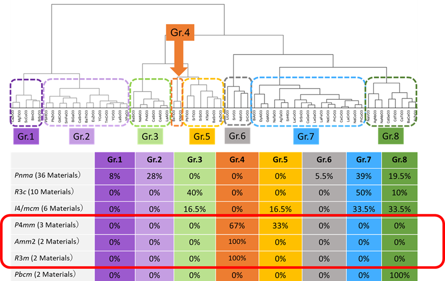 本研究では、ファインセラミックスセンター(森分博紀、設樂一希、横井里江、加藤丈晴)、芝浦工業大学(山本文子(工学部教授)、村瀬公俊(大学院理工学研究科博士(後期)課程地域環境システム専攻1年))との共同研究により、これまでの合成実験を主体とする材料探索では探索することのできない、準安定な材料を含めた広大な材料空間をくまなく探索するために、第一原理計算に基づくフォノン計算を活用してマテリアルズインフォマティクスによる巨大誘電率材料の探索スキームを開発、実施し、複数の候補材料の導出に成功した。具体的には図2に示すように、第一原理計算に基づくフォノン計算を用いたマテリアルズインフォマティクスを開発した。テストとしてICSDデータベースにペロブスカイト型結晶構造化合物として登録されている61材料に対して網羅的な第一原理計算に基づくフォノン計算を行い、階層型クラスタリングにより分類することにより、巨大誘電率を示すBaTiO3と類似のフォノン分散を有する材料を明確に分類できていることを確認した。この方法を合成されていない仮想的な材料も含め525種類に拡大適用して、RbNbO3など複数の巨大誘電率候補材料の導出に成功した。